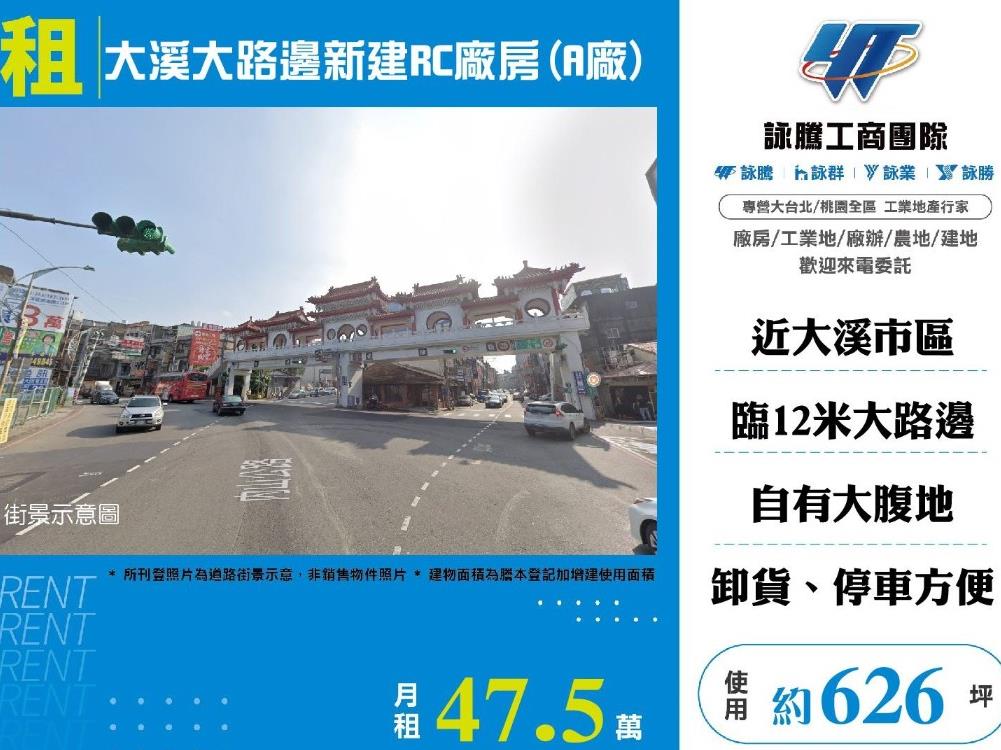 ※近交流道及大溪市區 ,交通便捷 ※臨12米大路邊,自有大腹地,卸貨、停車方便 ※挑高6米 好規劃利用 ※市區旁 標的顯著 有店面效益 ※A廠626坪 租金47.5萬/月 B廠601坪 租金45萬/月