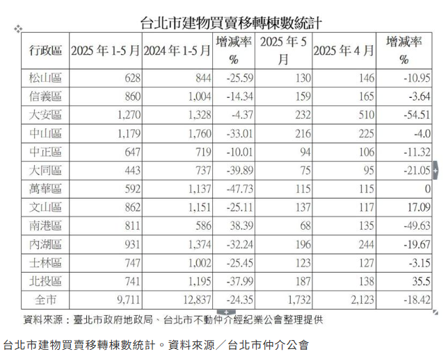 根據台北市地政局的統計,5月台北市建物買賣移轉棟數仍然呈現萎縮之勢,與4月比較起來衰退幅度達到18.4%,是一幅旺季不旺的格局,單月交易量不足2千件,12個行政區當中只有文山區及北投區是正成長,而且北投區還逆勢大幅成長35.5%,跟大安區及南港區大幅衰退五成左右形成強烈的對比。