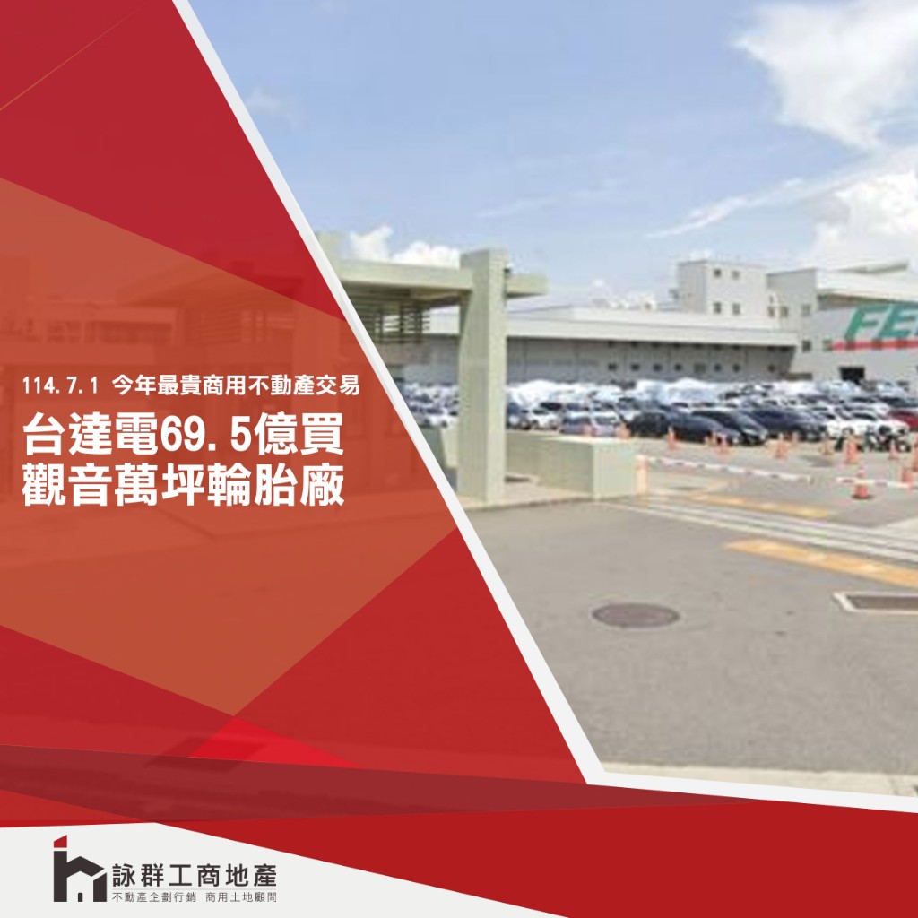 泰豐輪胎(2102)以69.5億元出售桃園觀音廠區,買方是台達電(2308),主要是看上距離中壢總部車程不遠,立地條件適合而購入。商仲表示,本次交易為今年目前為止,全台最高金額的商用不動產交易。